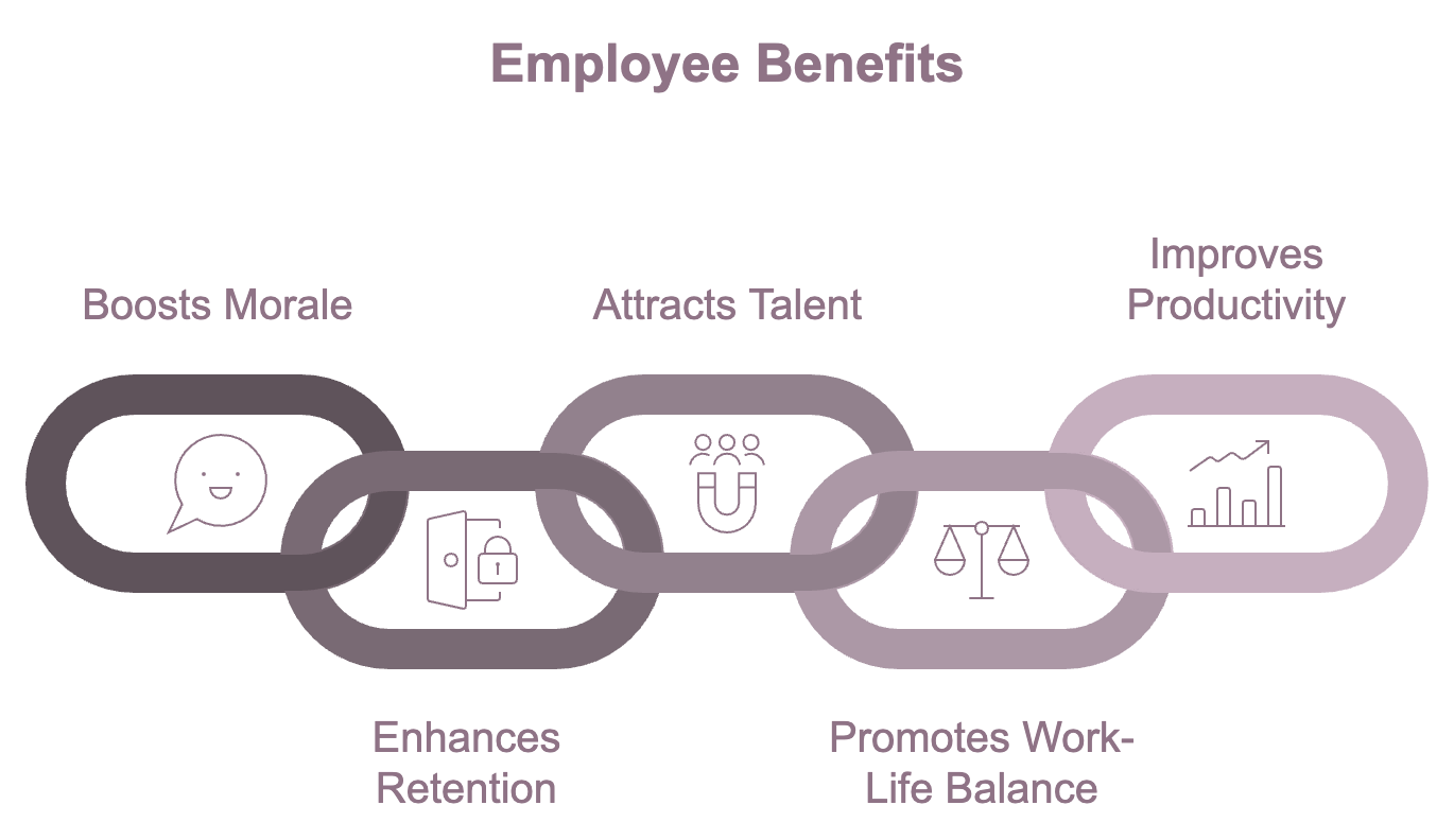 Promotes Work-Life Balance: Benefits like paid leave, remote work options, and childcare support help employees manage their personal and professional lives, reducing burnout and improving mental well-being.
