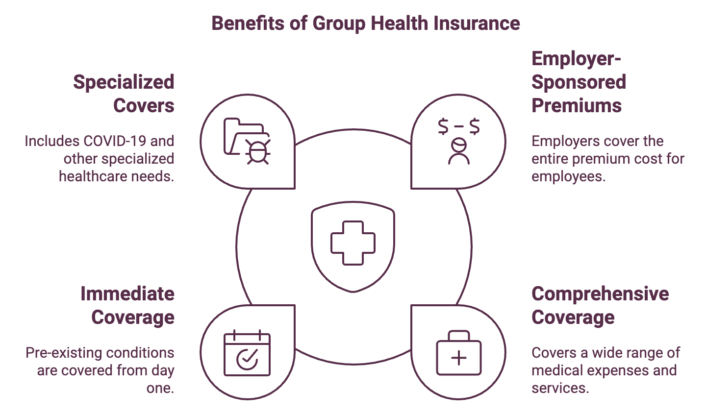 Group Health Insurance: Pre-existing conditions are covered from day one, without any waiting period, ensuring employees can access necessary care immediately.
