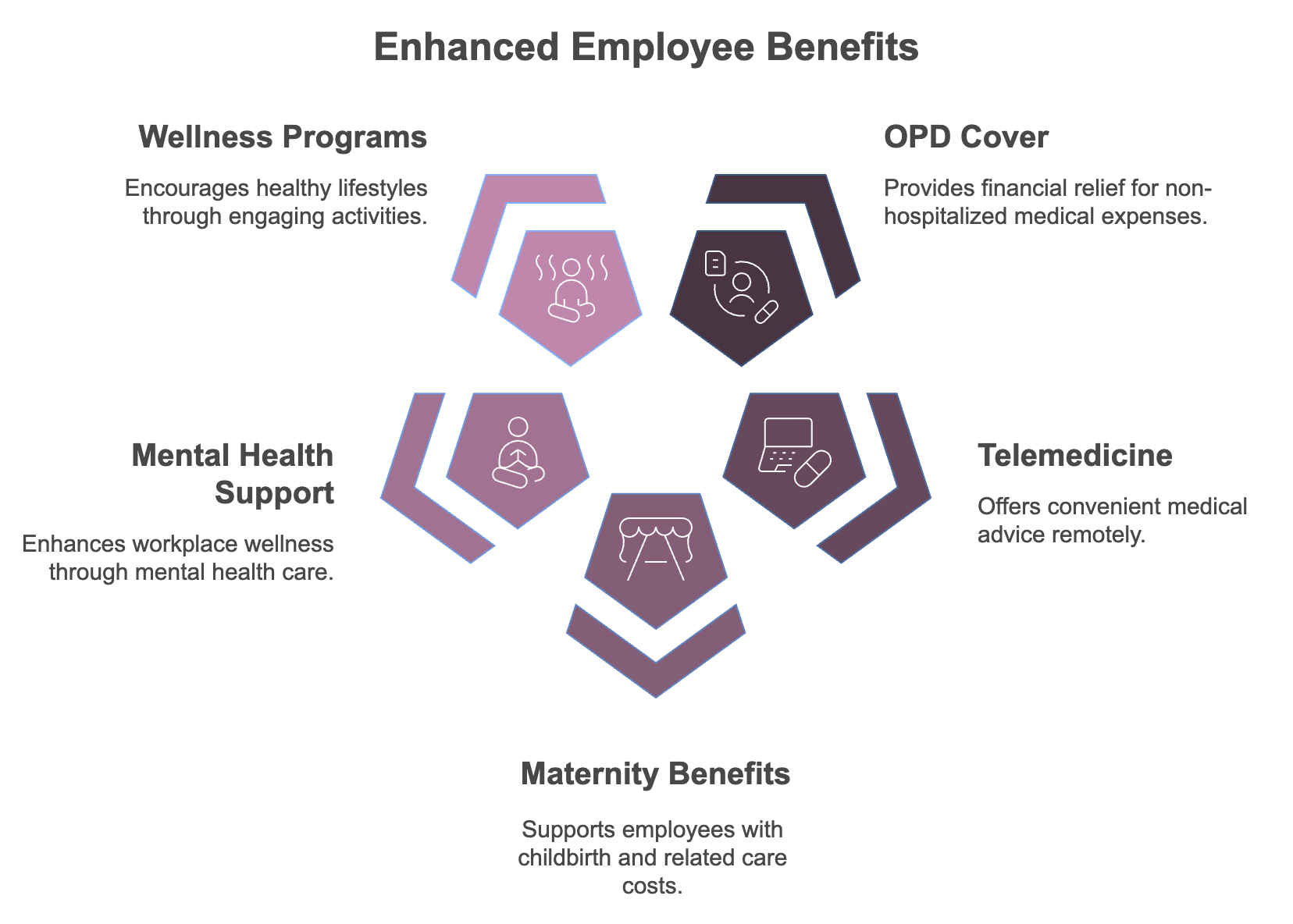 Employers now offer plans with add-ons such as OPD cover, maternity benefits, mental health support, wellness programs, and telemedicine services.