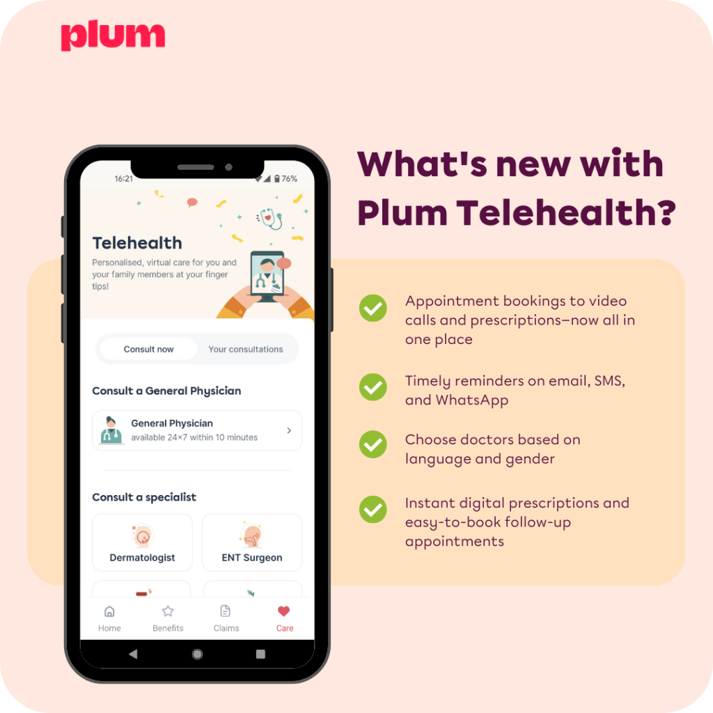 We’ve built Plum Telehealth from the ground up. The new experience, now restricted only to our mobile app, brings you a simplified doctor selection, appointment booking, video calling, and prescription delivery experience.